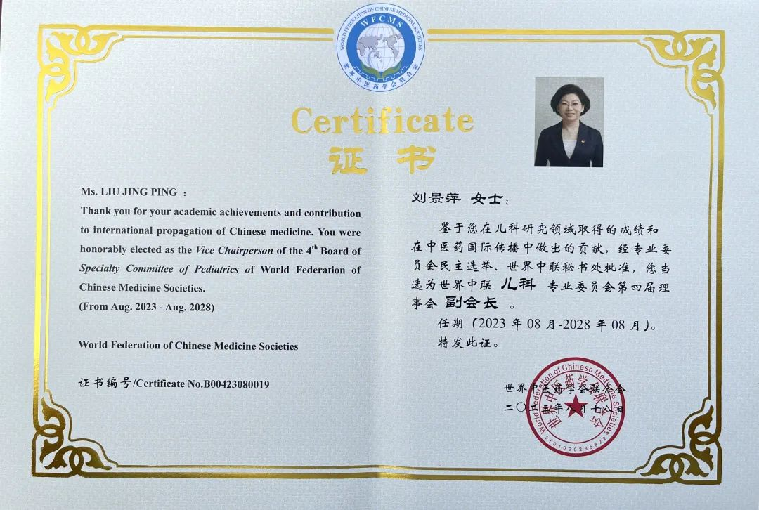 CA88药业集团党委书记、董事长刘景萍当选世界中医药学会联合会儿科专业委员会第四届理事会副会长